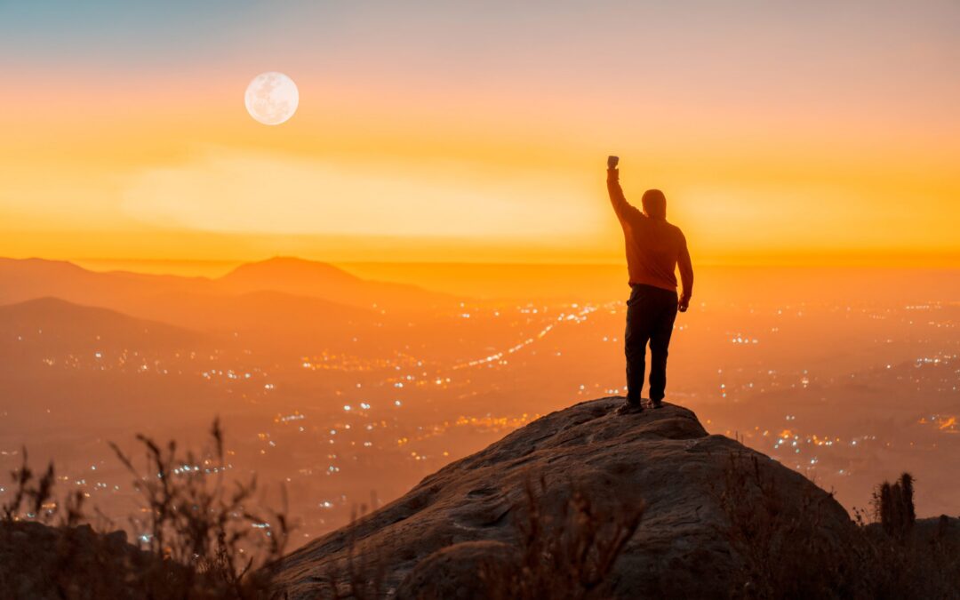 person standing on the top of the mountain with hand up, back view, over the city at sunset