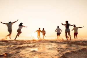 Big group of friends or big family run at sunset beach