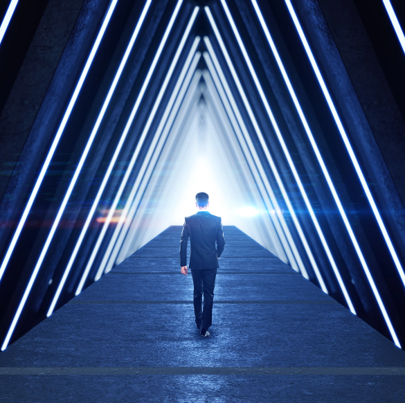 businessman-walking-interior-with-abstract-luminous-triangle-corridor