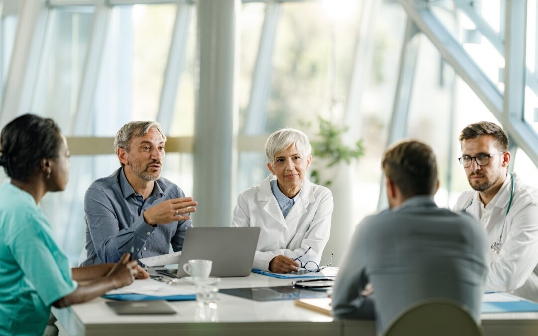 Group of doctors and businessmen talking on a meeting at doctor’s office.