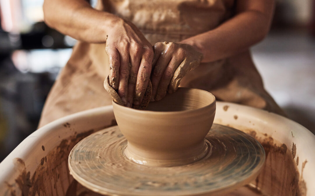 Pottery artist, designer or employee molding an object with clay at a factory, studio or art class. Ceramist, potter or person creating, shaping and making a bowl with hands at an artistic workshop