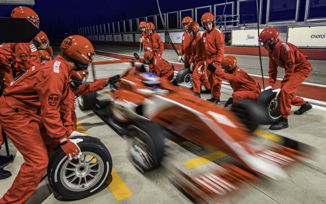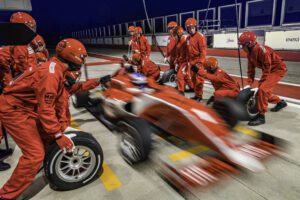 Red formula race car leaving the pit stop